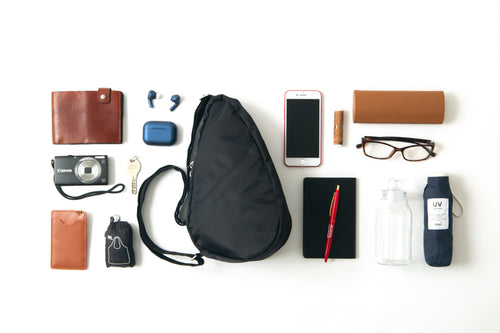 外出時の必需品はもちろん、本やエコバッグ、ペットボトルなどの+αアイテムが持ち運べるサイズ感。ちょっとしたおでかけや旅行先での持ち歩きにぴったりのサイズです。前後どちらでも背負えて自由なスタイルでお楽しみいただけます。