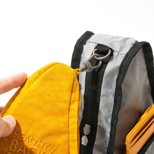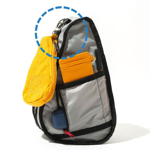 バッグ内部の上部には新たにDリングを搭載!パスケースなどを上部にかけ、吊るした状態で収納することができます。ご好評いただいているヘルシーバックバッグのノベルティアイテム、ミニポーチをかけても便利!デッドスペースになりがちなバッグの上部もあますことなく活用でき、荷物の底だまり防止に◎