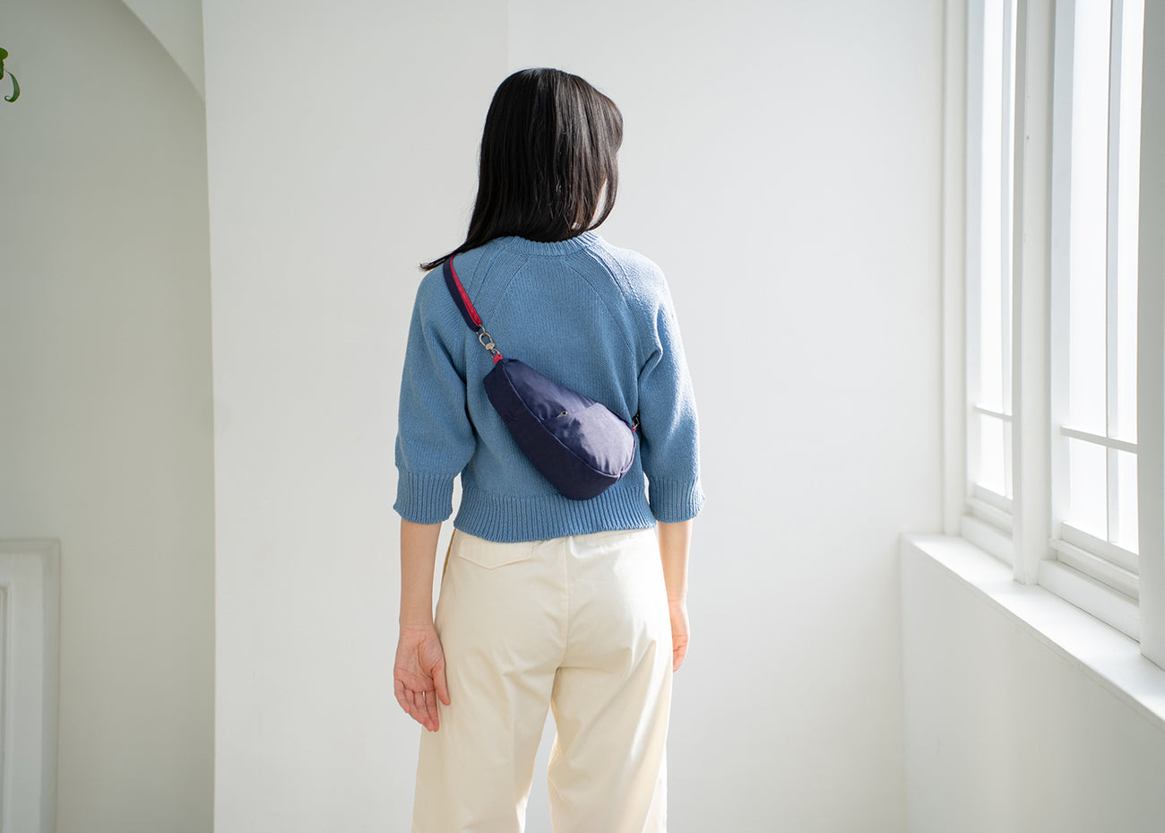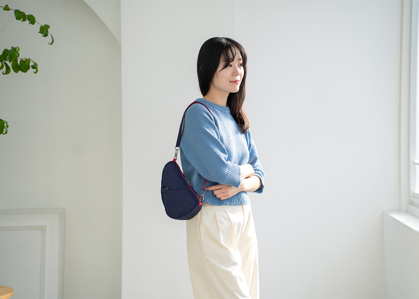シャカシャカとした肌ざわりで、風合いのあるマーブル模様が特徴のナイロン生地を使用。洗濯機で丸洗いが可能です。コンパクトな見ためながら、500mlのペットボトルが収まるほどの収納力で、お買い物やサブバッグとして大活躍。