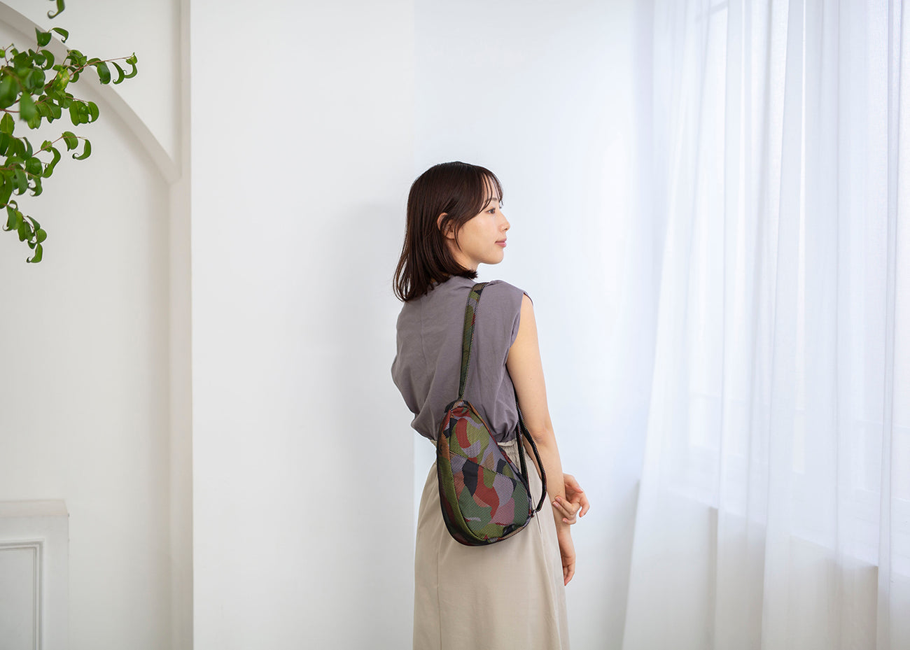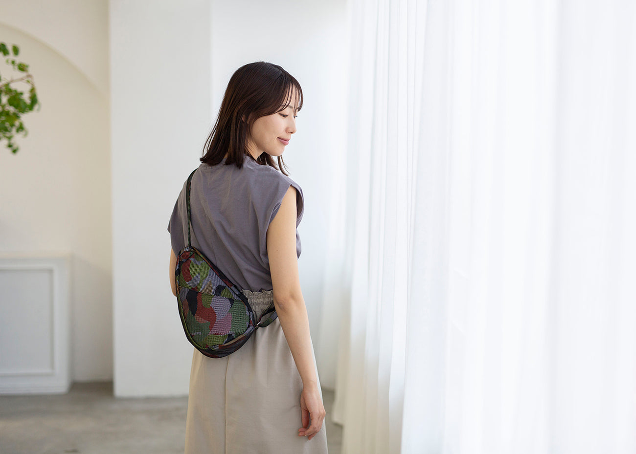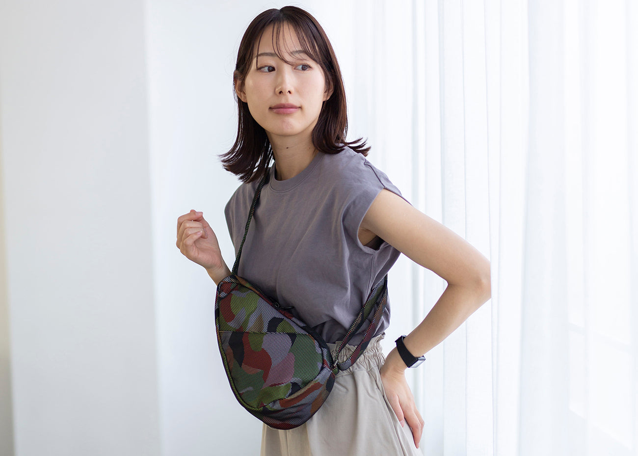 軽くさらさらとした質感のリサイクルポリエステル素材。必需品を持ち運ぶのにちょうど良い、容量3.5Lのボディバッグスタイルです。